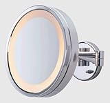 In Stock Hardwired model. 10 inch diameter optical quality mirror. Dual Arm Wall Mount that Extends 15" From Wall. Halo Lighted Elegantly crafted with full 5x power magnification mirror. The fine mirror head is mounted on an adjustable swing-arm that will extend up to 15 inches. When the mirror is not in use it stores flush to the wall. Color: Polished Chrome Diameter: 10 in Magnification Power: 5X Package includes an extra Light Bulb. Note: Hardwired model.- Polished Chrome Finish