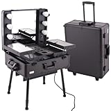 In Stock Stylish & trendy, this Professional Studio Trolley Case is sturdy and high quality designed whenever you're ready on the go. This Makeup Artist Train Case is one of the unique cosmetic case that has Built in 4 telescoping legs (Maximum height 32.5 inch) for quick and easy set up wherever you are at indoor or outdoor projects. Lighted 17 inch mirror has Six (6) 40-watts lights let you adjusting with light dim control (Require power supply to operate. This function does not work on CFL bulbs.) 110-240 Volts Circuit. Auxiliary power outlets.2 glass cover padded trays offer easy access to your goodies while there has 2 padded trays underneath keeping other cosmetic handy. 1 Center tray, 1 Rear compartment and 1 Side compartment with elastic band to hold and organize your accessories. High quality black aluminum finish with black aluminum trimming and construction with reinforced steel corners for extra durability. Heat resistant exterior material keeps this rolling train case cool and protects your cosmetics. Retractable / telescoping handle with inline skate wheels let you easily transporting. 2 Heavy duty handles added comfort and carrying option. 2 Lock and key system added security. A great substitute as your own personal makeup vanity table. Overall case dimension: 22.75" L x 18" W x 8.75" H 4 telescoping legs. Maximum: 32.5" H Top cover mirror dimension: 17" H x 14.25" W 4 padded tier trays dimension: 11.75" L x 6.5" W x 1" H Center tray dimension: 13.25"L x 12.5" W x 1.25" H Rear compartment dimension: 13.75" L x 3.75" W x 3.25" H Side compartments with elastic band dimension: 17.25" L x 3.75" W x 3.25" H 110-240 Volts Circuit. Auxiliary power outlets Telescoping handle fully extended height: 41" 2 Heavy duty handles added comfort and carrying option. - Lighted 17 inch mirror for Six (6) 40-watts lights with light dim control.