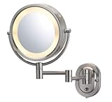 In Stock This halo lighted mirror is used in luxury hotels and day spas and is the epitome of excellence in beauty products. This product extends up-to 14-inches from its wall mount and is 8-inches in diameter. The nickel finish protects against dust and moisture and meshes a rustic charm with city living. This mirror has two reflective sides that swivel for a regular mirror or a 5x magnification mirror. This product glides with the touch of a finger, but is firm enough to hold its place for odd angles. The nickel finish is especially designed to add an aesthetic charm to your lavatory or dressing room. This product comes complete with mounting hardware and is easy to install. Jerdon provides a 1-year, limited warranty that protects against any defects due to faulty material or workmanship. Jerdon Style has earned a reputation for excellence in the beauty industry with its broad range of quality cosmetic mirrors (including vanity, lighted and wall mount mirrors), hair dryers and other styling appliances. Since 1977, the Jerdon brand has been a leading provider to the finest hotels, resorts, cruise ships and spas worldwide. Jerdon continues to evolve with and shape how stylists envision beauty and fashion.- Nickel finish protects against dust and light moisture & Unit has a corded wall plug